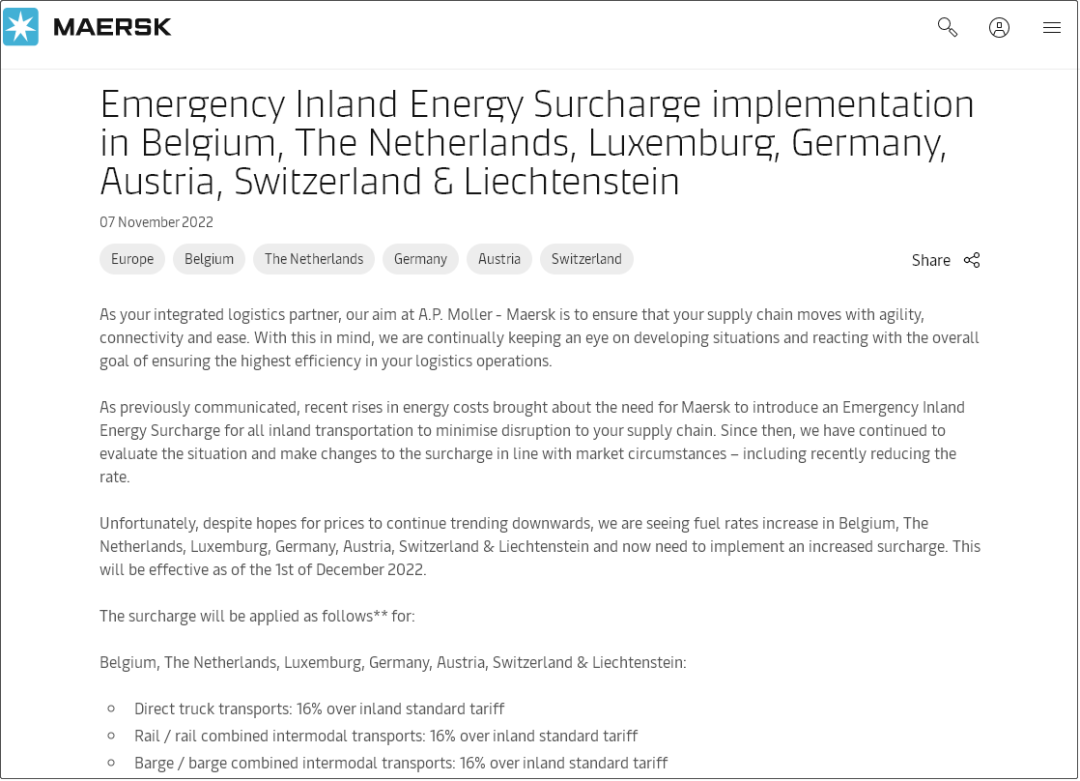 11月7日,马士基发布通知称,最近能源成本的上升导致其需要为所有内陆运输引入紧急内陆能源附加费(Emergency Inland Energy Surcharge),以尽量减少对供应链的干扰。该公司表示,比利时、荷兰、卢森堡、德国、奥地利、瑞士和列支敦士登的燃油价格正在上涨,现在需要提高附加费。这将于2022年12月1日生效。